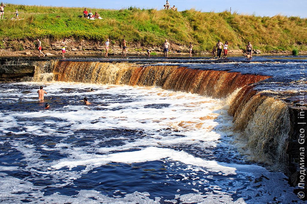Водопад искусственного происхождения, доступен в любое время года. Вода в реке насыщена частичками торфа, поэтому создается красный оттенок воды.
