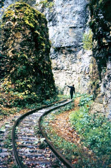 Внизу, под скалами, змейкой изгибается одноколейная железная дорога, . Длина ущелья около пяти километров, глубина — 400 метров, .