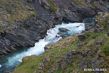 Река делает крутой правый поворот и входит в каньон, где находится водопад. Река делает крутой правый поворот и входит в каньон, где находится водопад.